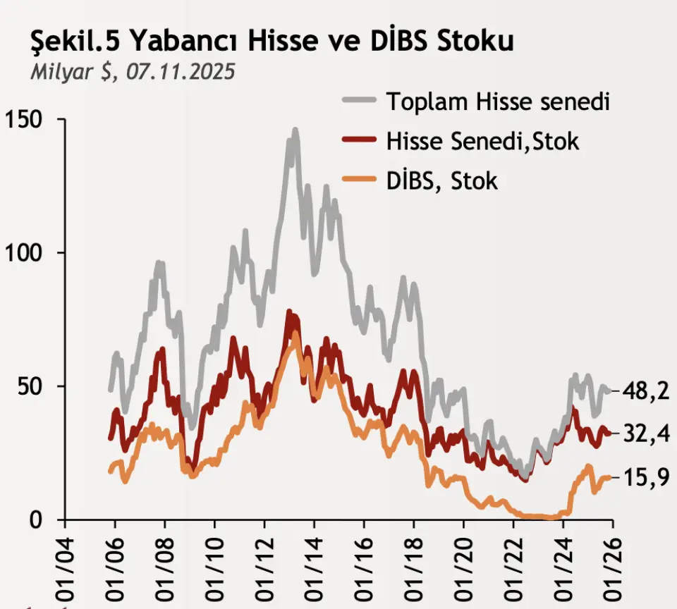Yurt dışı yerleşik yatırımcılar Ekim’de hisse alımında ivme kaybetse de alımlarını sürdürdü. TCMB verilerine göre 7 Kasım haftasında net 35,7 milyon dolarlık hisse alımı gerçekleştirildi. Önceki hafta bu tutar 243 milyon dolar seviyesindeydi. Tahvil alımları ise 297 milyon dolar seviyesinde gerçekleşti; bir hafta önce bu tutar 454,9 milyon dolardı. Aynı dönemde yabancıların DİBS stoku 15 milyar 570,2 milyon dolardan 15 milyar 852,2 milyon dolara yükselirken, ÖST stokları ise 524 milyon dolardan 516,2 milyon dolara geriledi.