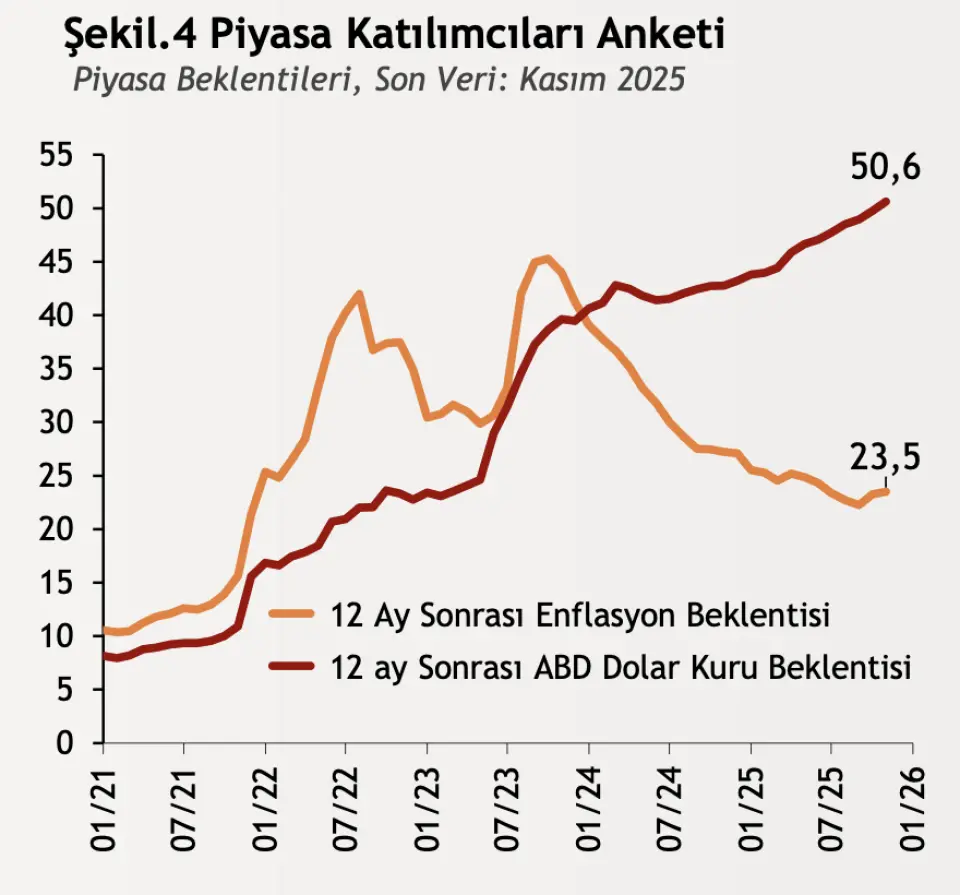 TCMB’nin Piyasa Katılımcıları Anketi’ne göre, katılımcıların Kasım ayı için TÜFE artış beklentisi %1,55’ten %1,59’a yükseldi. Yıl sonu TÜFE beklentisi ise %31,77 seviyesinden %32,20’ye çıktı. Sene sonu Dolar/TL beklentisi 43,56’dan 43,42’ye gerilerken, 12 ay sonrası için beklenti 49,75’ten 50,61’e yükseldi.