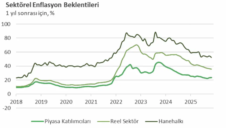 2018 yılı öncesinde, reel sektörün ve piyasa katılımcılarının enflasyon beklentileri arasındaki fark yaklaşık 1,5 puan iken, hane halkı ile piyasa katılımcılarının enflasyon beklentileri arasındaki fark yaklaşık 15 puan civarında idi. Kasım 2025 itibari ile, geçen bir yılda gerilemekle birlikte, piyasa katılımcılarının enflasyon tahminleri ile reel sektör tahminleri arasındaki fark yaklaşık 15 puan ve hane halkının enflasyon tahminleri arasındaki fark ise yaklaşık 30 puan seviyelerine geriledi.