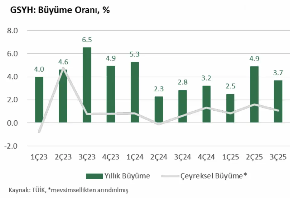 Türkiye ekonomisi, üçüncü çeyrekte yıllık bazda %3,7 büyürken; çeyreklik veriler, bir önceki döneme göre bir miktar ivme kaybı olsa da %1,1’lik artışla ılımlı büyüme eğiliminin korunduğuna işaret etti.