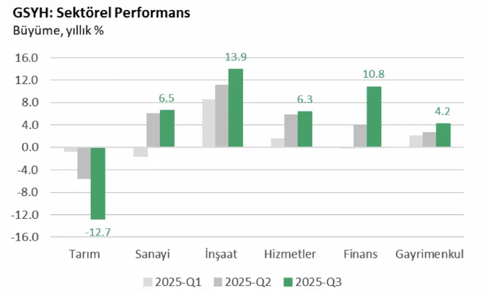 3.çeyrekte inşaat sektörü yıllık %13,9 büyüme ile başı çekerken, bilgi ve iletişim faaliyetleri %10,1, finans ve sigorta faaliyetleri %10,8 büyüdü. Sanayi %6,5 ve hizmetler %6,3 büyüme sağladı.