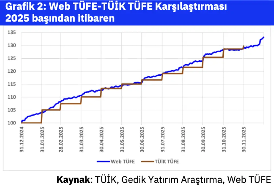 Gedik Yatırım:"Aralık ayında TÜFE enflasyonunun aylık %1,0 olacağını tahmin ediyoruz. Aralık ayında web üzerinden topladığımız Web TÜFE verileri ile aylık enflasyonun %1,0 olarak gerçekleşeceğini tahmin ediyoruz. Yılın son 2 ayı mevsimsel etkilerle enflasyonu aşağı çekerken bu ay hizmet enflasyonun oldukça ılımlı gerçekleşmesini, akaryakıt indirimleriyle enerji grubunun yataya yakın seyretmesini, temel mal enflasyonunun geçen aya benzer gerçekleşmesini beklerken, ay sonuna doğru gıda kaynaklı risklerin arttığını görüyoruz.
