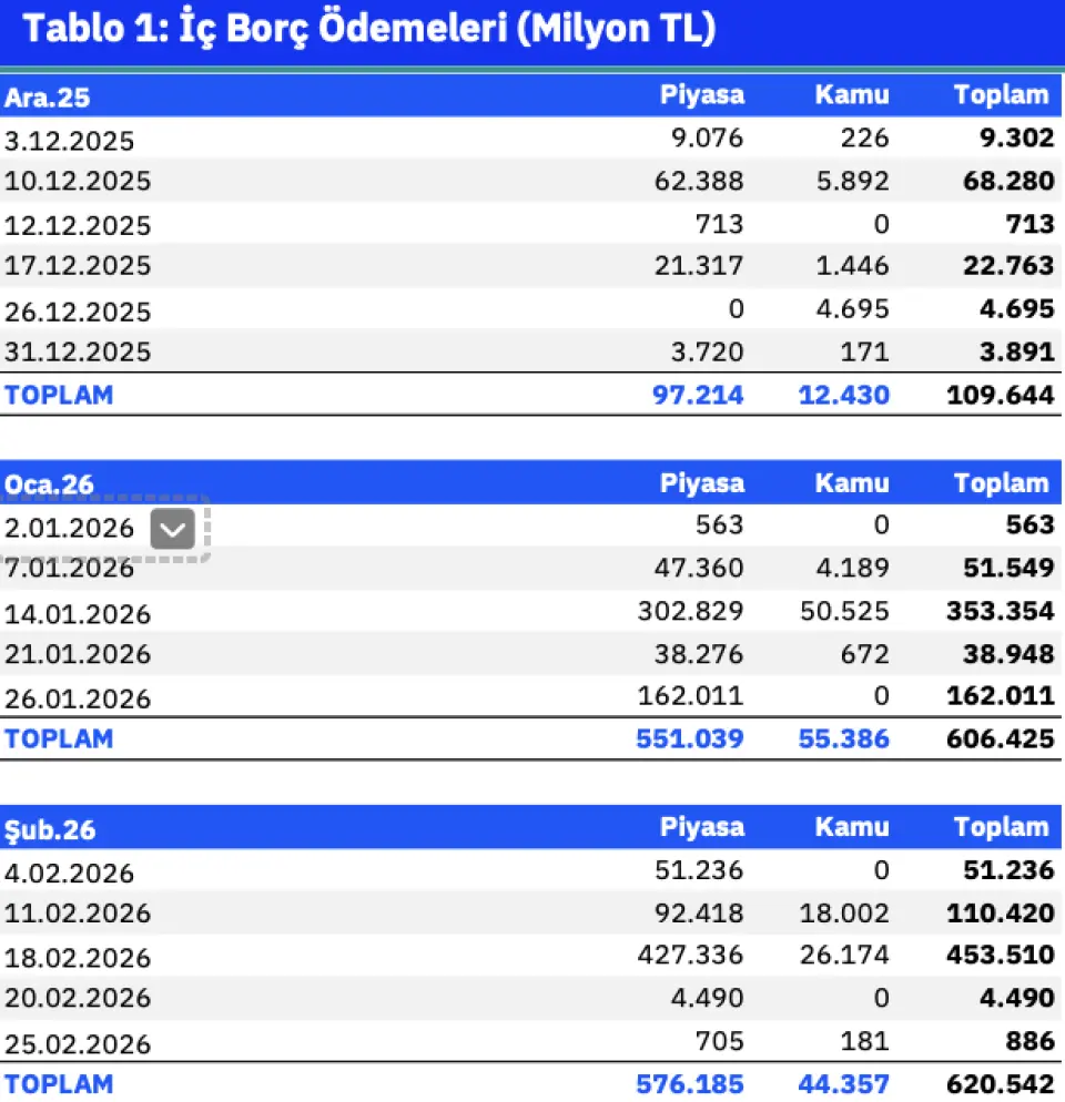 Hazine Aralık-Şubat dönemi toplamında ise 663 milyar TL'si anapara ve 674 milyar TL'si faiz olmak üzere 1,34 trilyon TL'ye yakın iç borç geri ödemesi gerçekleştirecek. Dış borç geri ödemelerinin TL karşılığının ise yaklaşık 267 milyar TL olması öngörülüyor. Hazine toplamda 1,25 trilyon TL iç borçlanma planlarken, bu yaklaşık %99'luk bir iç borç çevirme rasyosuna denk geliyor. Bu rakamlara göre, bu dönemde, Hazine'nin net iç borçlanma tutarının (yeni tahvil ihracının) ise yaklaşık 587 milyar TL olması öngörülüyor.