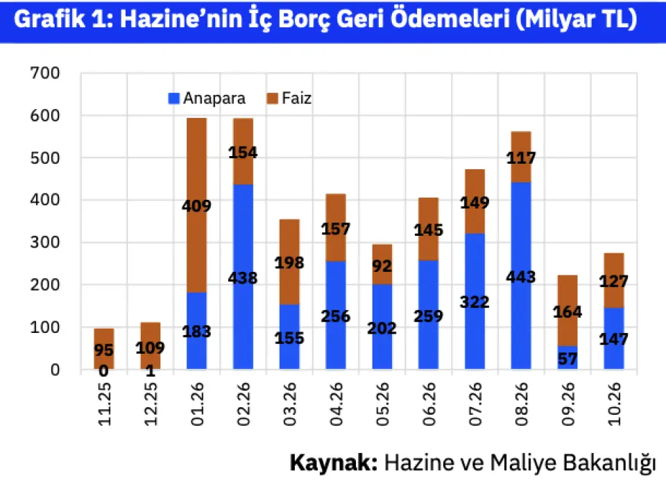 Hazine'nin Ekim 2026 sonuna kadar açıkladığı borç geri ödeme projeksiyonlarına göre Kasım 2025 ile Ekim 2026 arasında yaklaşık 4,4 trilyon TL'ye yakın iç borç geri ödemesi görünüyor. Kısa vadeli tahvil ihraçları dikkate alındığında bu tutarın da aşılma ihtimali bulunuyor. Bu dönemde öngörülen dış borç geri ödemesi ise 22,5 milyar $'ı aşıyor, ki bu da iç borçlanmanın bir bölümünün dış borç geri ödemelerine aktarılmasının gerekeceğine İşaret ediyor.