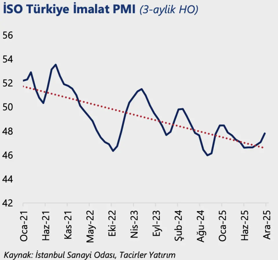 İstanbul Sanayi Odası (İSO) Türkiye İmalat PMI, aralık ayında 48 seviyesinden 48,9'a çıkarak son bir yılın en yüksek düzeyine ulaşırken, 50 eşik değerin altında kalmaya devam etti. Böylelikle imalat PMI endeksi, yılın son çeyreğinde ortalama 47,8 seviyesinde oluşarak üçüncü çeyreğe göre (46,63) toparlanma sinyali verdi. Nisan 2024'ten bu yana 50 eşik değerinin altında seyreden PMI, sektörün 1,5 yılı aşkın süredir ivme kaybettiğini gösterirken, endeks seviyesinde son dönemde izlenen toparlanma, sektör aktivitesindeki daralmanın yavaşladığına işaret ediyor.