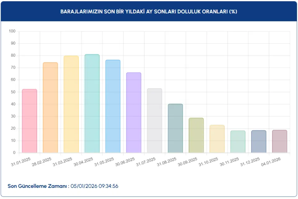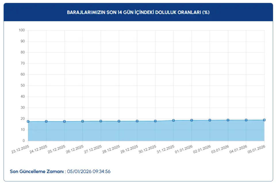 Böylece 5 Ocak 2026 tarihinde İstanbul Su ve Kanalizasyon İdaresi (İSKİ) tarafından açıklanan verilere göre ortalama baraj doluluk oranı %18.94 olarak açıklandı.
