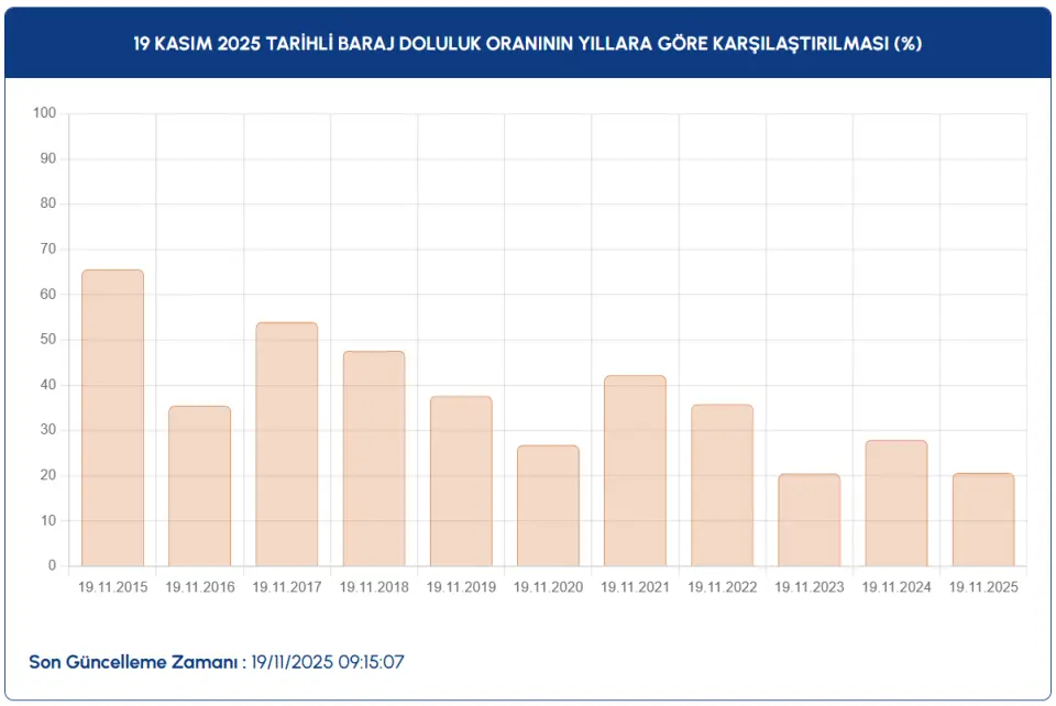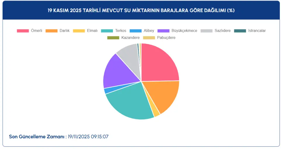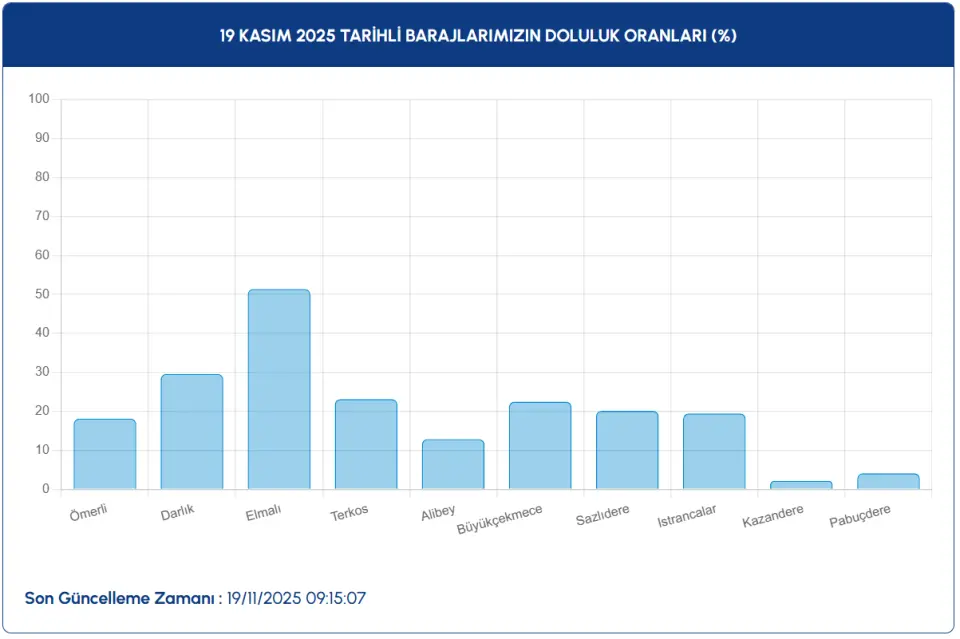 Böylece 19 Kasım 2025 tarihinde İstanbul Su ve Kanalizasyon İdaresi (İSKİ) tarafından açıklanan verilere göre ortalama baraj doluluk oranı %20,67 olarak açıklandı. Su seviyesinin en düşük olduğu 2 baraj Kazandere (2,17) ve Pabuçdere (4,1) oldu.