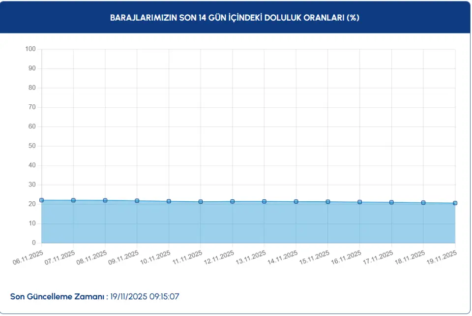 İSKİ tarafından 19.11.2025 tarihinde saat 09.15'te paylaşılan verilere göre, İSKİ ortalama baraj doluluk oranı %20.67