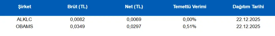 - MAALT – Şirketin 1.672.957 adet payının KCHOL’e pay başı 956,39 TL fiyatla toptan alış satış işlemiyle satışı için Borsa İstanbul’a başvurduğu ve işlemin 22.12.2025’te yapılmasının planlandığı açıklandı.