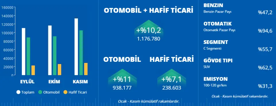 Türkiye otomobil ve hafif ticari araç toplam pazarı, 2025 yılı Ocak-Kasım döneminde bir önceki yılın aynı dönemine göre %10,16 oranında artarak 1.176.780 adet olarak gerçekleşti. Otomobil satışları, 2025 yılı Ocak-Kasım döneminde geçen yıla göre %10,96 oranında artarak 938.177 adet, hafif ticari araç pazarı ise %7,13 artarak 238.603 adet oldu.