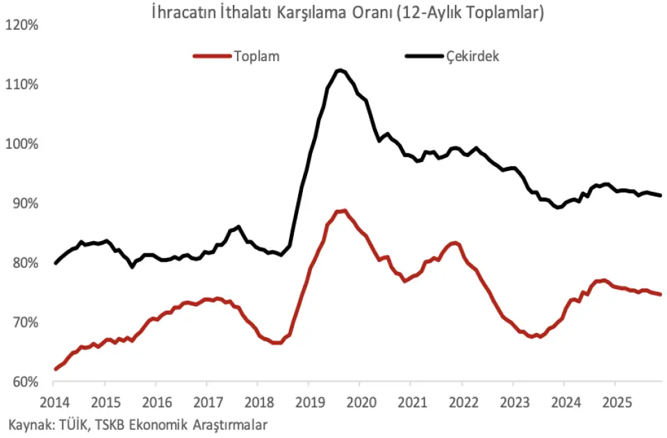 İhracatın ithalatı karşılama oranı Kasım'da bir önceki yıla göre gerilerken, dış ticaret açığı genişledi. İhracatın ithalatı karşılama oranı bir önceki yılın aynı ayındaki %74,8 seviyesinden %73,8'e indi. Dış ticaret açığı 7,5 milyar dolardan 8,0 milyar dolara çıktı. Yıllık bazda altın ve enerji ürünleri hariç çekirdek ihracat %3,2, çekirdek ithalat da %6,0 genişledi. 2024 Kasım'da yaklaşık 1,2 milyar dolar olan altın ve enerji hariç çekirdek dış ticaret açığı 2025'in aynı ayında 1,9 milyar dolara yükseldi.
