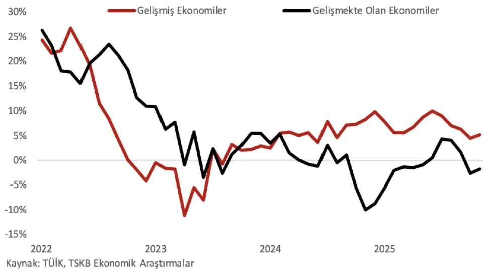 Kuzey Amerika'ya yapılan ihracatta son aylarda görülen daralmada ABD tarafından Türkiye'ye uygulanan gümrük vergilerinin ortalamada efektif tarife oranlarının üzerinde kalmasının etkili olduğunu düşünüyoruz. Görece küçük diğer pazarların genelinde de karışık bir tablo vardı. Bu sonuçlarla gelişmiş ekonomilerin toplamına yapılan ihracat yıllık bazda %3,1 yükselirken, gelişmekte olan ekonomilerin toplamına yapılan ihracat %0,9 daraldı.