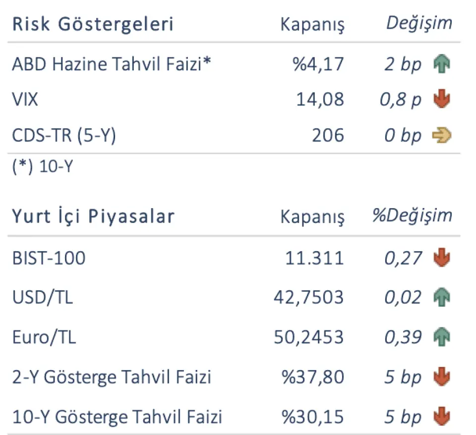 BIST-100 endeksi Pazartesi gününü %0,3 düşüşle 11.311 seviyesinde tamamladı. Türkiye’nin 5 yıllık CDS primi 206 baz puan seviyesinde yatay kalırken, 2 ve 10 yıllık gösterge tahvil faizleri 5’er baz puan düşerek %37,80 ve %30,15 oldu.