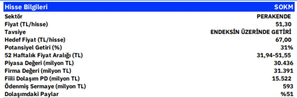 Gedik Yatırım SOKM için hedef fiyat açıkladı. Bu günlerde 50 TL civarı işlem gören hisse için 67 TL hedef fiyat verildi.