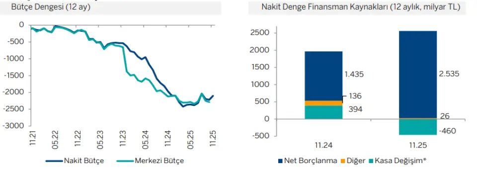 Ocak-Kasım 2025’te nakit bütçe açığı önceki yıla göre neredeyse değişmedi. Orta Vadeli Program’a (OVP) göre yılsonunda merkezi bütçe açığının 2.208 milyar TL olacağı öngörülüyor. 2025 yılında nakit ve merkezi bütçe açığının denk geleceği varsayımı ile 2025 yılı bütçe hedefinin altında kalınması için aralıkta nakit bütçe açığındaki artışın % 33’ün altında gerçekleşmesi gerekiyor. Ocak-Kasım gerçekleşmesi değerlendirildiğinde, 2025 yılı bütçe hedefinin tutmasını bekliyoruz. OVP’ye göre, bütçe açık/GSYH öngörüsü 2025 için %3,6, 2026 için %3,5.