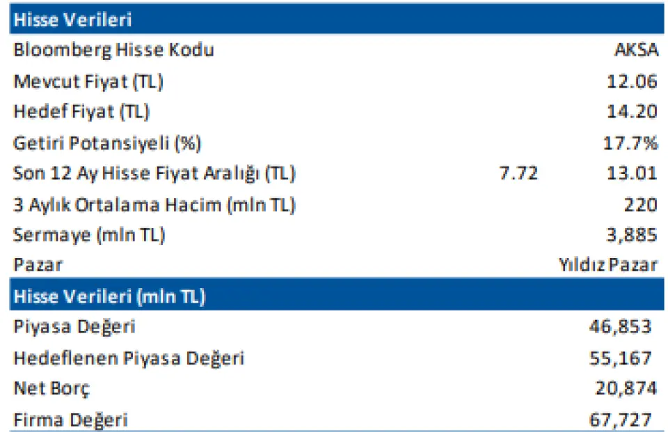 Şirketin karlılığında gözlenen artış hisse için verilen hedef fiyatları da yükseltti. Deniz Yatırım hisse için daha önce 13,02 TL hedef fiyat vermişti. Kurum hedef fiyatını 14,20 TLye yükseltti. AKSA borsada 11 TL fiyatın altında işlem görüyor.