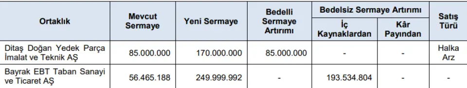 DITAS %100 bedelli sermaye artırımı onaylandı Şirketin yeni sermayesi 170.000.000 TL olacak.BAYRK %342,75 oranında bedelsiz sermaye artırımı onaylandı. Şirket sermayesini 249.999.992 TL ye çıkartıyor.