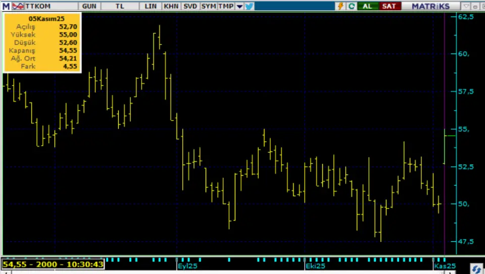 TTKOM bugün saat 10.33 itibariyle 55 TL en iyi fiyat gördü. Hissenin tarihi zirvesi yakın 62,80 TL. Hisse bu hızda devam ederse zirve fiyata ulaşmak zor olmayacak gibi görünüyor.