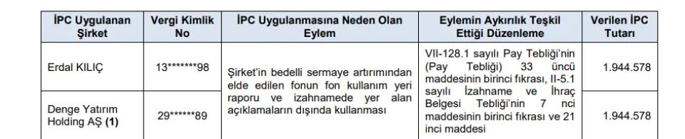 Söz konusu eylemin, VII-128.1 sayılı Pay Tebliği’nin 33. maddesi ile II-5.1 sayılı İzahname ve İhraç Belgesi Tebliği’nin 7. ve 21. maddelerine aykırılık teşkil ettiği belirtildi.
