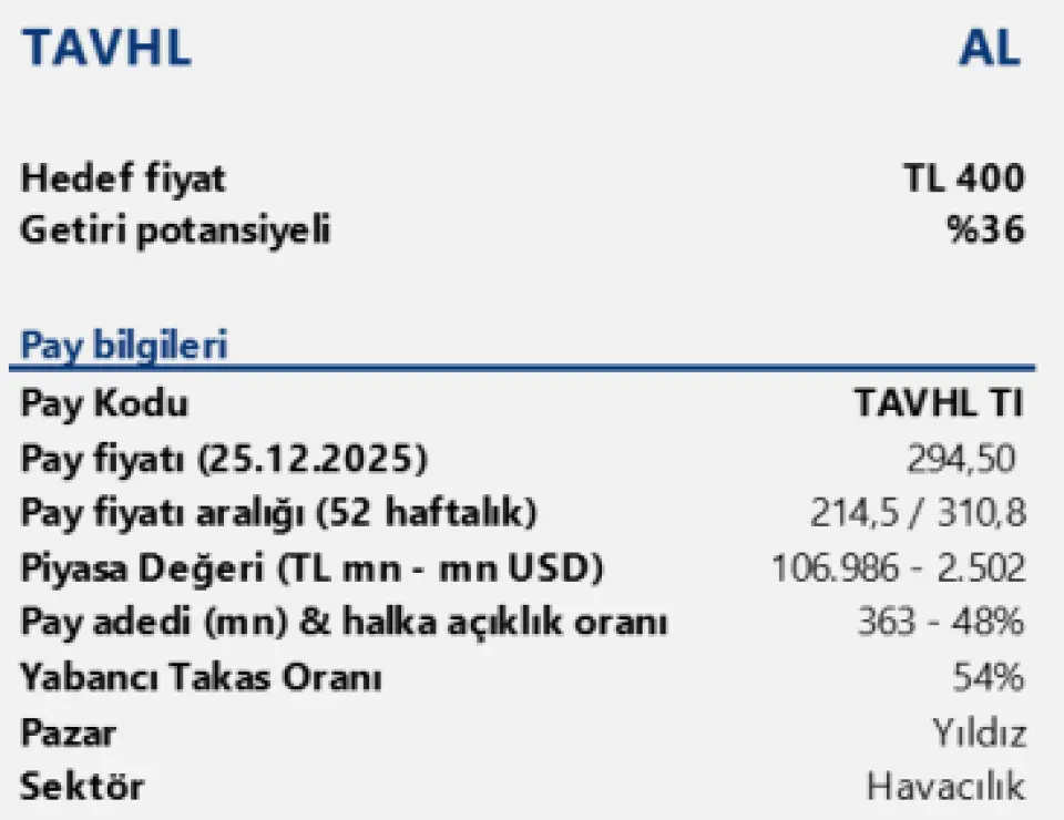 Genel olarak 2026 yılının, operasyonel genişleme, yüksek marjlı dış hat katkısı, güçlü iç turizm talebi ve imtiyaz portföyünde artan görünürlük doğrultusunda TAV Havalimanları için hem karlılık hem de serbest nakit akışı yaratma kapasitesi açısından olumlu bir yıl olmasını bekliyoruz. Bu doğrultuda büyüme varsayımlarımızı yukarı yönlü güncellerken, hedef fiyatımızı 400 TL’ye yükseltiyor ve AL tavsiyemizi koruyoruz.