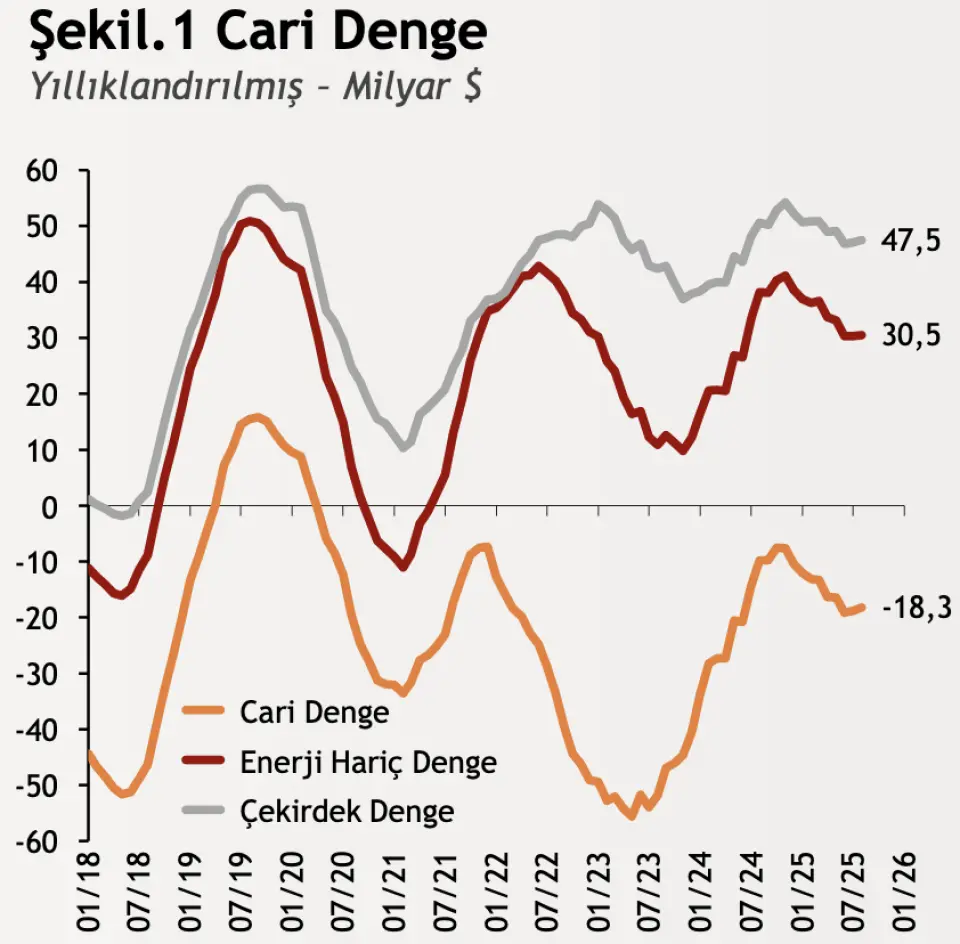 Yıllıklandırılmış cari açık 18,28 milyar dolara ulaşırken altın ve enerji hariç cari işlemler hesabı 10 milyar 5 milyon dolar fazla verdi.