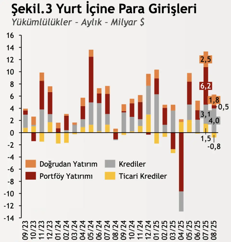 Cari açığın finansmanı tarafında Ağustos ayında yurt içine 986 milyon dolarlık net sermaye girişi gerçekleşti. Böylece yıllıklandırılmış bazda doğrudan yatırım sermaye girişi 6,5 milyar dolara ulaştı.