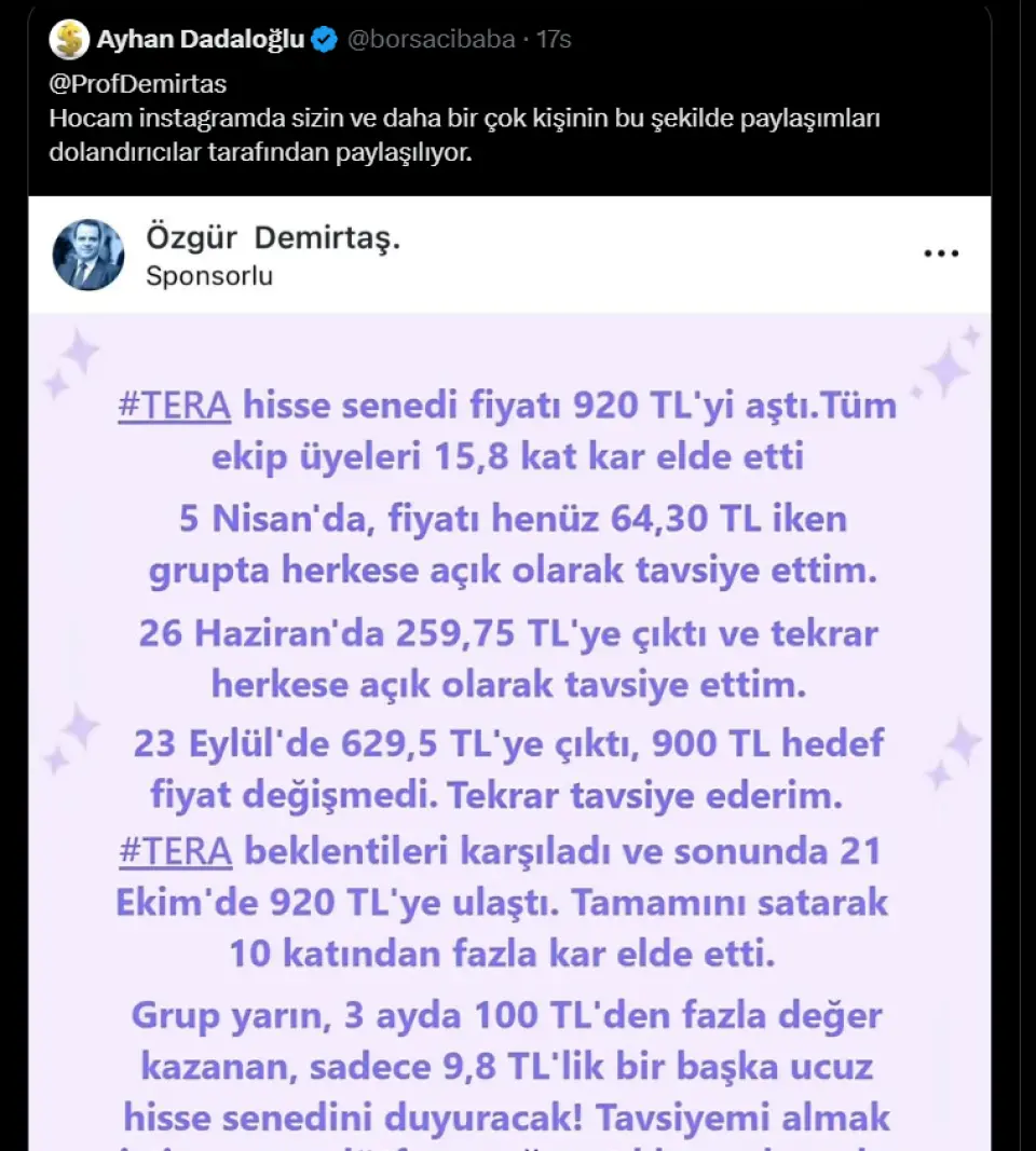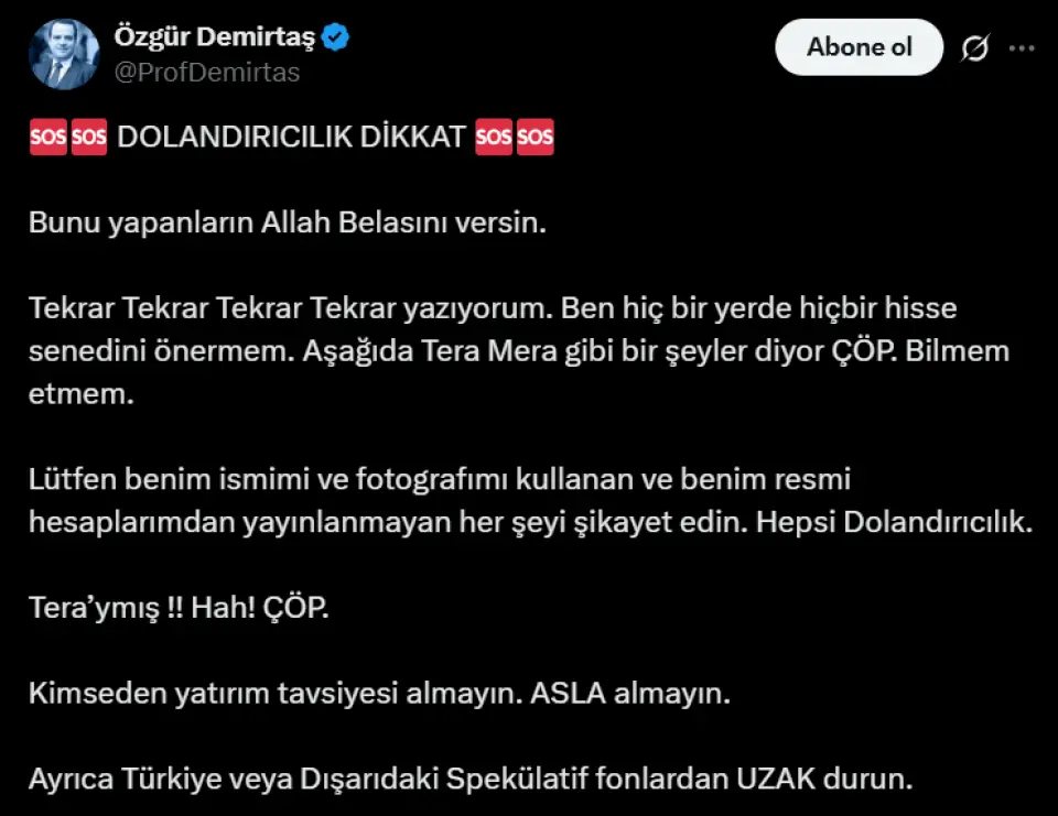 Olay, Demirtaş’ın X (Twitter) hesabından yaptığı uyarıyla başladı. Ünlü ekonomist, adının ve fotoğrafının kullanılarak sahte yatırım reklamları yapıldığını belirterek, “Bunu yapanların Allah belasını versin. Ben hiçbir yerde hisse senedi önermem. Aşağıdaki gibi şeyler ÇÖP, dolandırıcılık.” ifadelerini kullandı. Paylaşımında “Tera Mera” benzeri isimleri hedef alarak, bu tür içeriklerin tamamen sahte olduğunu vurguladı.