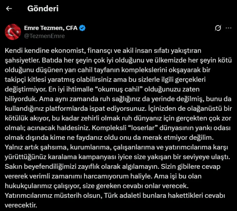 Demirtaş’ın açıklamasının ardından Emre Tezmen sert bir yanıt verdi. Tezmen paylaşımında isim vermeden, “Kendi kendine ekonomist, finansçı diyen şahıslar… Okumuş cahiller. Ruh sağlığınız yerinde değil, iç dünyanız zehir dolu.” ifadelerini kullanarak Demirtaş’a yüklendi.