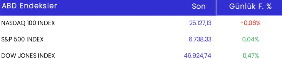 GE, savunma ve itki teknolojilerinde %26 gelir, motor teslimatlarında %83 artış açıkladı. Buna karşılık, Lockheed Martin (%–1,9) ve Northrop Grumman (%–2) zayıf görünüm sergiledi. Lockheed, üçüncü çeyrek satışlarını %12 artırsa da, dördüncü çeyrek kâr tahmini beklentinin altında kaldı. Northrop ise hükümetin kapanmasının ihalelerde gecikmelere yol açtığını belirterek yıl geneli gelir tahminini düşürdü. Uzun vadede artan küresel savunma harcamalarının sektörü desteklemesi bekleniyor.