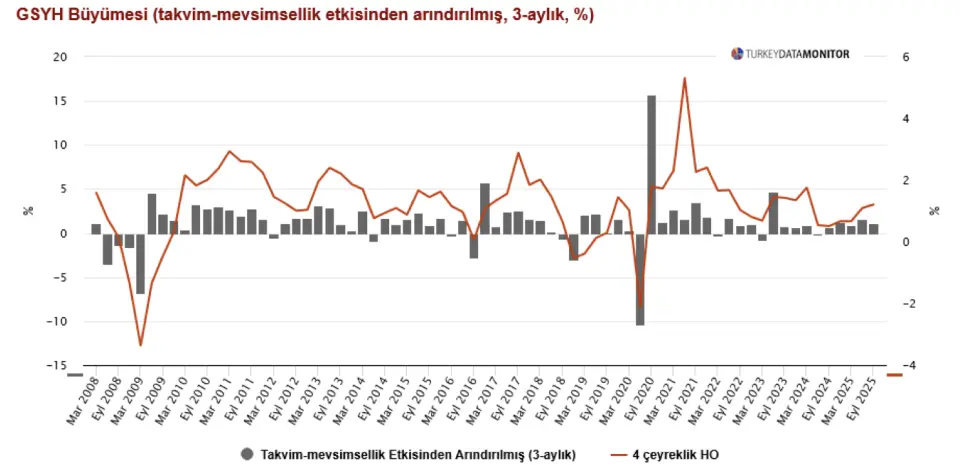 Mevsim ve takvim etkilerinden arındırılmış GSYH büyümesi bir önceki çeyreğe göre %1,1 büyüme gösterdi. Bloomberg'de yer alan piyasa beklentisi %+0,5 idi. (3C24: %+0,6, 2C25: %+1,6)