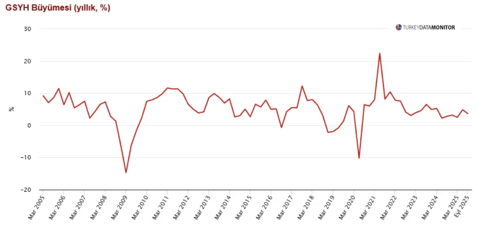 TUİK'in açıkladığı rakamlara göre Gayrisafi Yurt İçi Hasıla (GSYH) 2025 yılının üçüncü çeyreğinde reel olarak bir önceki yılın aynı çeyreğine göre %3,7 büyüme gösterdi. (3Ç24: %+2,8, 2025: %+4,9)Bloomberg'e göre piyasa beklentisi %4,2 büyüme idi.
