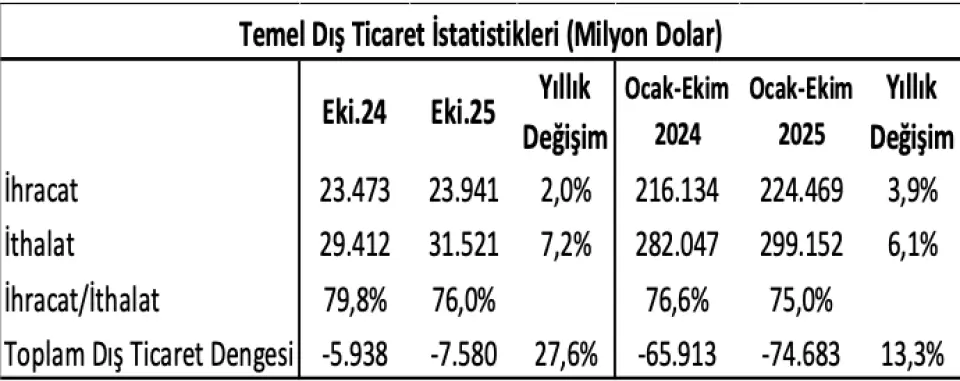 Ekim ayında ithalat ihracata göre yıllık bazda daha hızlı artış gösterdi. İhracat yıllık bazda %2,0 yükselerek 23,9 milyar dolar olurken, ithalat da %7,2 genişlemeyle 31,5 milyar dolar seviyesinde gerçekleşti.