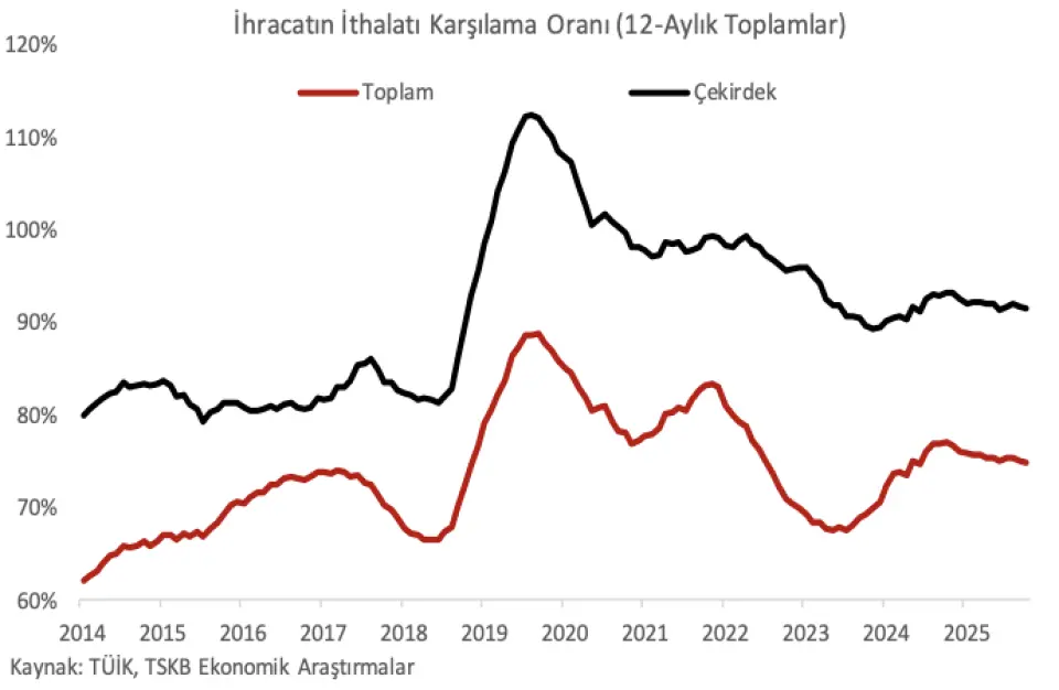 İhracatın ithalatı karşılama oranı Ekim'de bir önceki yıla göre gerilerken, dış ticaret açığı genişledi. İhracatın ithalatı karşılama oranı bir önceki yılın aynı ayındaki %79,8 seviyesinden %76,0'a indi. Dış ticaret açığı 5,9 milyar dolardan 7,6 milyar dolara çıktı. Yıllık bazda altın ve enerji ürünleri hariç çekirdek ihracat %3,8, çekirdek ithalat da %5,2 genişledi. 2024 Ekim'de yaklaşık 0,7 milyar dolar olan altın ve enerji hariç çekirdek dış ticaret açığı 2025'in aynı ayında 1,0 milyar dolara yükseldi.