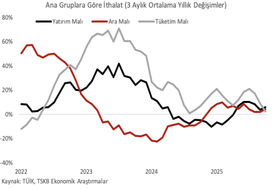 Ekim'de tüketim malı ithalatında yavaşlama görüldü. Yatırım ve ara malı ithalatı Ekim'de yıllık bazda sırasıyla %20,2 ve %7,3 yükseldi. Binek otomobil ithalatı %18,6 artış ile yükselişini sürdürse de, toplamda tüketim malı ithalatı yıllık bazda %4,3 daralma kaydetti. Üç aylık ortalamalara bakıldığında son üç aydır tüketim malı ithalatının yavaşladığı görülüyor. Dayanıklı ve yarı dayanıklı tüke- tim malları ithalatı yıllık bazda sırasıyla %54,2 ve %1,0 gerilerken, dayanıksız tüketim mallarında %17,4 artış görüldü.