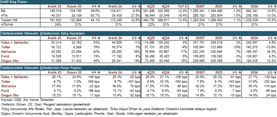 Türkiye Hafif Araç (HA) satışları Aralık 25'te yıllık bazda %12.6 artarak 191.6 bin adede yükseldi; bu da ay başındaki 154 bin adetlik tahminimizin %25 ve 121.3 bin olan 10 yıllık ortalamanın %58 üzerinde gerçekleşti. Aralık ayı başında, BA satışlarında yıllık bazda %10'luk bir düşüş bekliyorduk. Ancak, ayın ortasında, hafif ticari araç satışlarının 190-195 bin adet civarında olabileceğine dair bir işaret aldık. 2025 yılında, hafif ticari araç satışları yıllık bazda %10 artarak 1.368 bin adet ile tüm zamanların en yüksek yıllık seviyesine ulaştı. 3 yıl üst üste güçlü bir performansın ardından, 2026 yılında HA satış hacminin yıllık bazda %1 artacağına inanıyoruz.