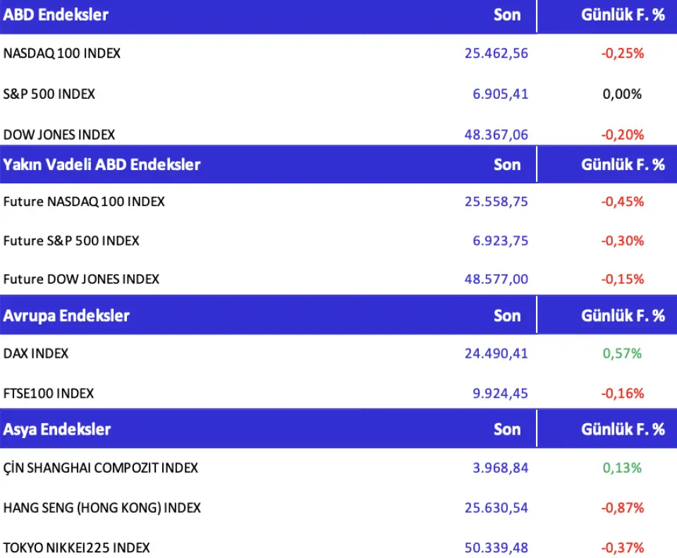 Hisse senedi piyasaları, yılın son işlem gününe zayıf bir görünümle başladı ve ABD vadeli endekslerinde sınırlı düşüşler izlendi. Düşük işlem hacmi etkili olurken, salı günü endeksler günü kayıpla kapattı. Yıl boyunca elde edilen makul getiriler ve yatırımcıların önemli kararlar öncesinde beklemeye geçmesi, bu ivme kaybında rol oynadı. Kısa vadeli zayıflığa rağmen, hisse piyasaları yılı genel olarak güçlü bir performansla tamamlamaya hazırlanıyor. ABD’de tahvil piyasaları yarım gün işlem görecek ve haftalık işsizlik maaşı başvuruları TSİ 16.30’da açıklanacak.
