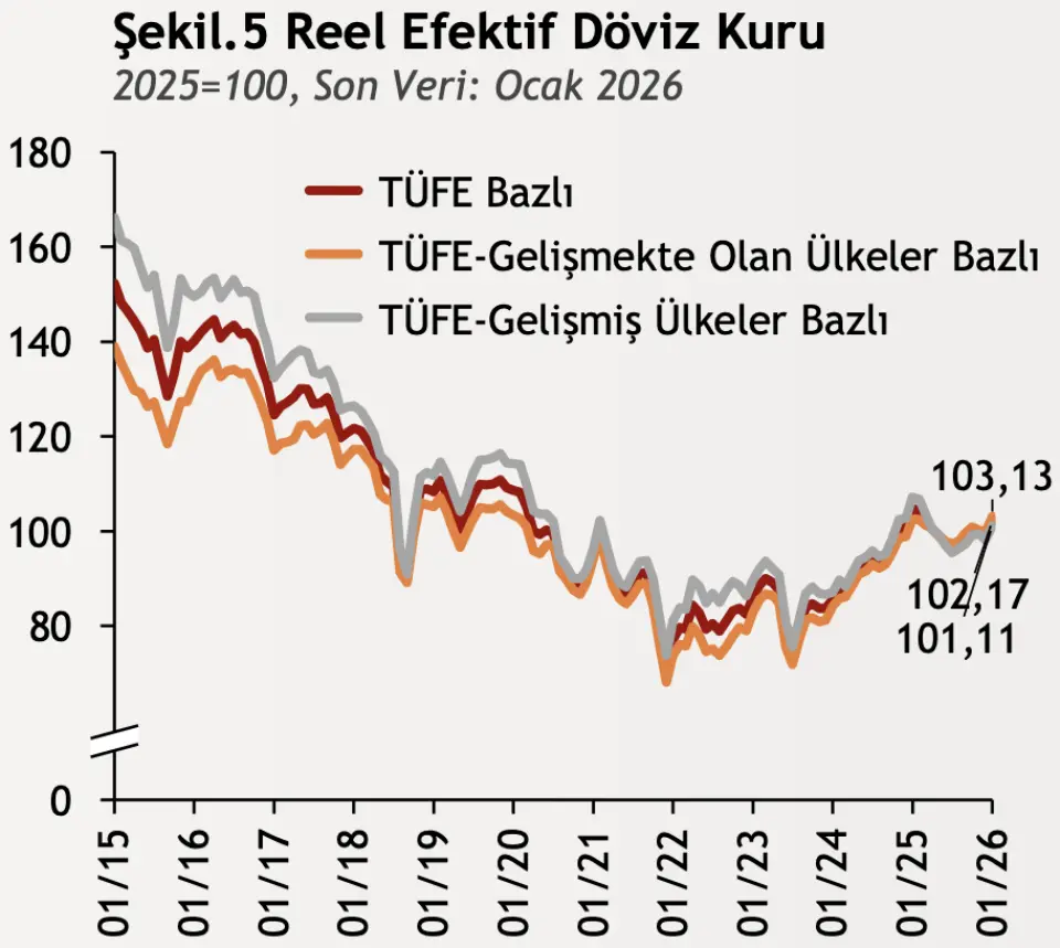 Ocak 2026'da TÜFE bazlı reel efektif döviz kuru endeksi aylık 3,16 puanlık artışla 102,17'ye yükselerek TL'nin reel değerinde yükselişe işaret etti. Endeks, 2025 Aralık'ta 99,01 düzeyindeydi. Bu yükselişin, TÜFE'deki artışın nominal kurdaki artıştan daha yüksek olmasından kaynaklandığı belirtildi. Yi-ÜFE bazlı endeks ise 0,96 puan artışla 99,95 seviyesine çıktı. Ayrıca TÜFE hesaplamasında yapılan değişiklik doğrultusunda, REK için baz yılı 2025 olarak güncellenerek ölçümlerin daha güncel hale gelmesi amaçlandı.
