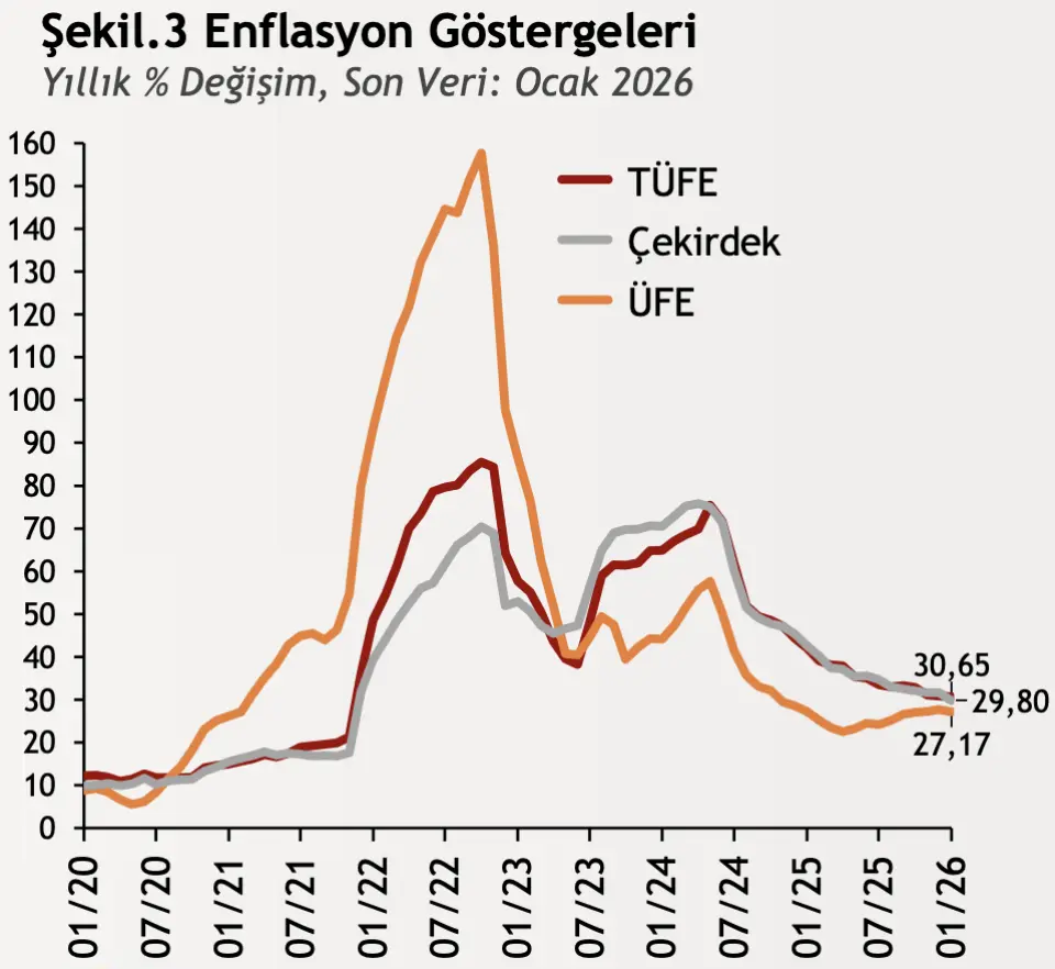 TÜİK verilerine göre Ocak ayında enflasyon aylık %4,84 artarak beklentilere paralel şekilde hızlandı. Yıllık enflasyon hafif gerileyerek %30,65'e, çekirdek enflasyon ise %29,80'e indi. Bu dönemde 13 harcama grubunun 12'sinde fiyatlar yükseldi. En yüksek artış %14,85 ile sağlıkta, %10,82 ile sigorta ve finansal hizmetlerde, %6,61 ile eğitimde kaydedildi. Bu yükselişte özellikle gıda fiyatlarındaki artışlar, sağlık grubunda katkı paylarına yönelik zamlar ve sigorta tarafındaki poliçe artışları belirleyici oldu.