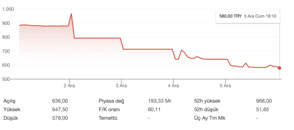 %1.022,94 kazandıran halka arz 968 TL'den 580 TL'ye düştü! TAVAN olan hisse aynı hafta içinde %34,35 kaybettirdi. Hissenin yeni haftada sergileyeceği performans yatırımcının odağında olacak.