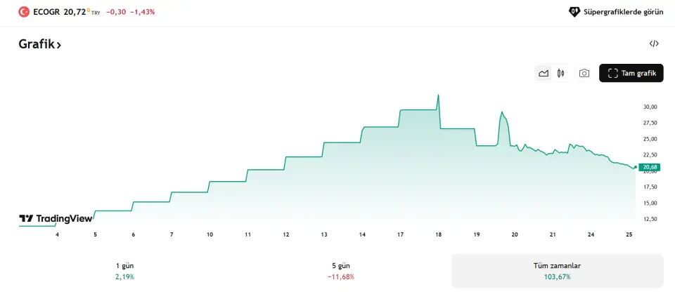 Ecogreen Enerji Holding A.Ş., son haftalarda borsanın en çok konuşulan hisseleri arasında yer almayı başardı. 11 TL seviyesinden işlem görmeye başlayan hisse, kısa sürede arka arkaya gelen tavan hareketleriyle dikkat çekti. Toplamda 10 kez tavan yaparak 27 TL seviyesine kadar yükselen fiyat, yatırımcısına yaklaşık yüzde 105 oranında kazanç sağladı. Bu performans, uzun süredir durgun ilerleyen halka arz piyasasında dikkatleri yeniden bu alana çevirdi.