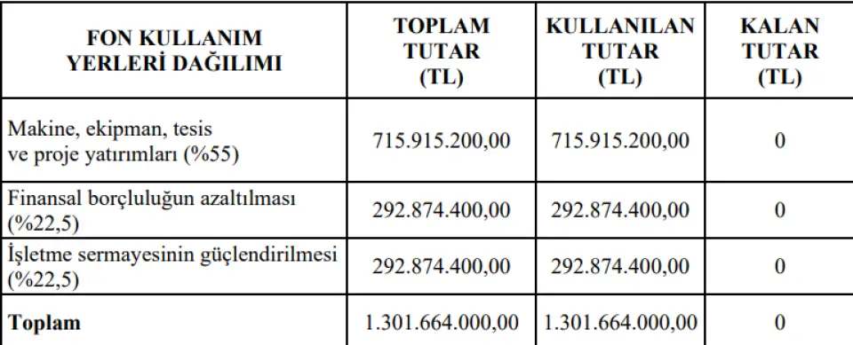 Bu kapsamda halka arz ile elde edilen fonun 23.12.2025 tarihi itibarıyla tamamı kullanılmış olup, amacına göre kullanılan tutarlar aşağıdaki tabloda belirtilmiştir;