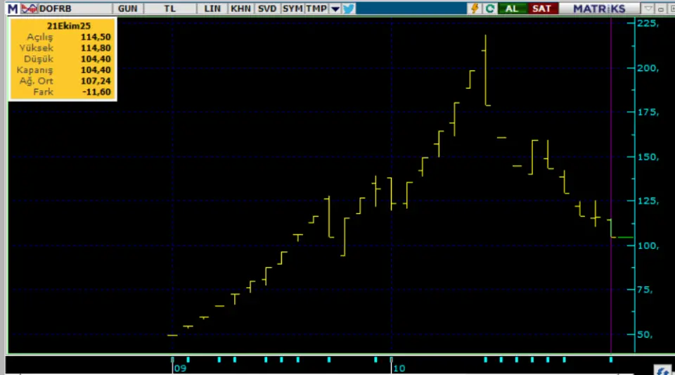 Borsanın en yeni hissesi olan Dof Robotik DOFRB 11 Eylük günü 45 TL halka arz fiyatıyla borsada işleme başladı. Hisse tam 21 gün süren ralli harekerine 19 tavan sığdırdı ve 218,30 TL fiyata kadar prim yaptı. O zirveden satış yiyen hisse bu günlerde 104 TL fiyata kadar çel-kildi.