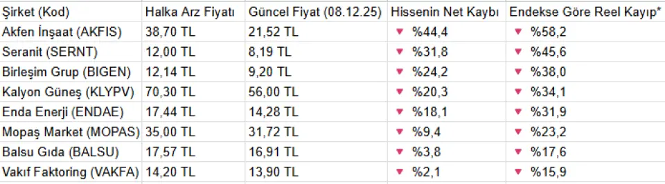Tabloya göre; örneğin Akfen İnşaat (AKFIS) halka arzına katılan bir yatırımcı paransının neredeyse yarısını (%44) eritmiş durumda. Ancak aynı parayı BIST 30 veya BIST 100 hisselerinde tutsaydı %14 kazanacaktı. Aradaki bu uçurum, yatırımcının servetinde %58'i aşan bir erime anlamına geliyor.