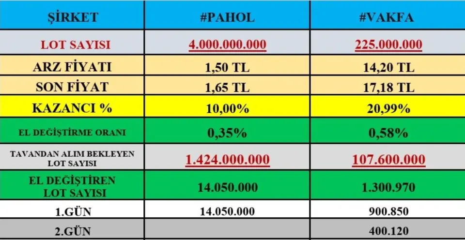 Son halka arz edilen hisselerde işlem başlangıcından itibaren yoğun talep dikkat çekiyor. Özellikle PAHOL ve VAKFA için paylaşılan veriler tavanda bekleyen alış lotlarının, halka arzla dağıtılan toplam lot miktarıyla neredeyse yarışır seviyeye geldiğini gösteriyor.