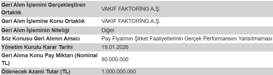 VAKFA tam 1 milyar Liralık pay geri alım kararını açıkladı. Şirket 80 milyon lot hissesini borsadan geri alacak. İşin en tuhaf tarafı şirket halka arzında zaten, sermaye artırımı yoluyla 50 milyon lot hisse halka arz edilmişti. Şirket sermaye artırımı yaparak halka arz ettiği lottan daha fazla hisseyi borsadan geri alacak.