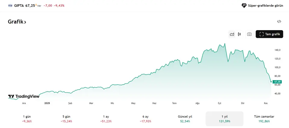 Son 1 ayda %50 oranında değer kaybeden hisse 67 TL bandına kadar geriledi. Bu sert düşüş yatırımcıların dikkatini yeniden buraya çevirdi. Ancak tablo genel olarak olumsuz. Şirketin hissesi, son dönemde ciddi bir düşüş trendine girdi ve ne zaman toparlanacağı belirsiz.