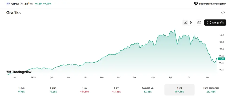 Son 1 ayda %44 değer kaybı yaşayan hisse, 71 TL seviyelerine kadar geriledi. Bu sert geri çekilme yatırımcıların yeniden Gıpta Ofis’e dönüp “ne oluyor?” diye bakmasına neden oldu. Ancak genel tabloya bakıldığında görünüm olumsuzluğunu koruyo. Hisse son dönemde ciddi bir düşüş trendine girmiş durumda ve toparlanmanın ne zaman geleceği tamamen belirsiz.