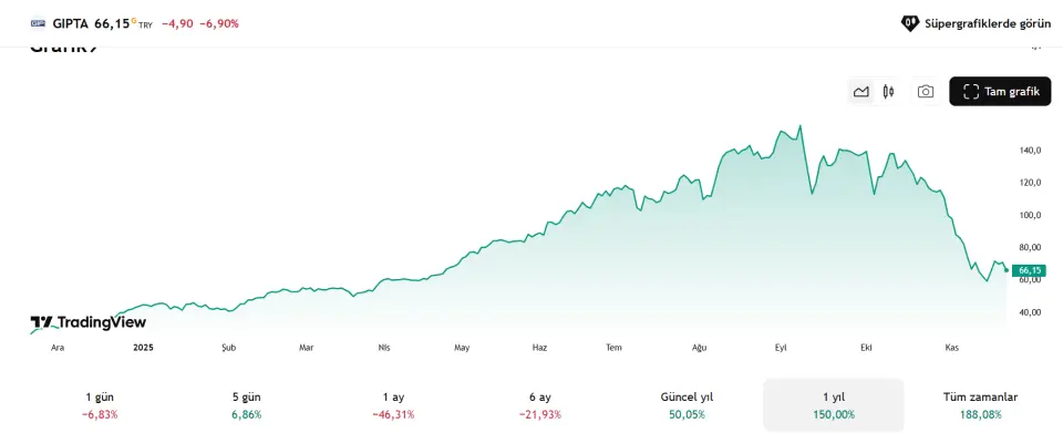 Son 1 ayda %46 değer kaybeden hisse, 66 TL seviyelerine kadar geriledi. Bu sert geri çekilme yatırımcıların tekrar Gıpta Ofis’e dönüp “ne oluyor?” diye bakmasına sebep oldu. Genel tabloya bakıldığında ise görüntü hâlâ zayıf. Hisse son dönemde belirgin bi düşüş trendine girmiş gibi duruyo ve bu trendin ne zaman kırılacağı da şimdilik belirsiz.