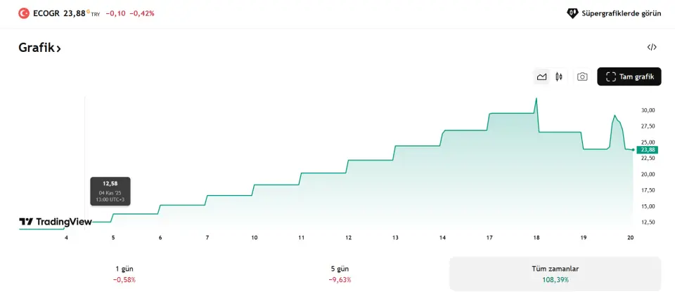 Kısa sürede tam 10 kez tavan yapan Ecogreen hissesi, 26,64 TL seviyesine kadar çıkarak yatırımcısına yaklaşık %150 civarında getiri sağladı. Bu kadar kısa sürede gelen bu sert yükseliş yatırımcı tarafında hem heyecan hem de “biraz fazla mı hızlı gidiyo acaba?” şeklinde bir tedirginlik yarattı.