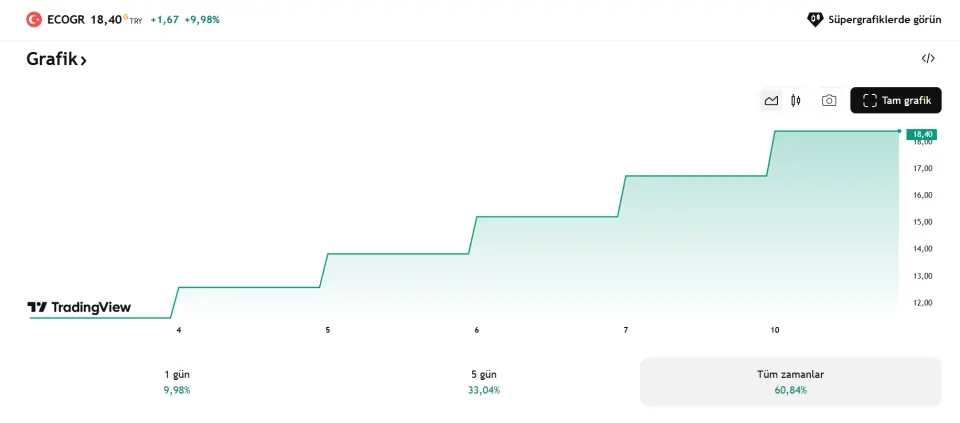 Kısa sürede tam 5 kez tavan yapan Ecogreen hissesi, 18,4 TL seviyesine kadar yükselerek yatırımcısına yaklaşık %60 civarında getiri sağladı. Bu kadar kısa zamanda gelen yükseliş, yatırımcılar arasında hem heyecan hem de tedirginlik yarattı.